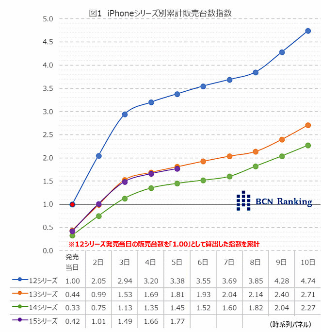 2023年9月22日に発売になったiPhone 15シリーズ。販売の初速を12シリーズ以降の4シリーズで比較した。すると、一つ前の14シリーズよりも好調に推移していることが、家電量販店・ネットショップの実売データを集計する「BCNランキング」から明らかになった。また、発売から5日間の各シリーズにおけるモデル別構成比も比較した。