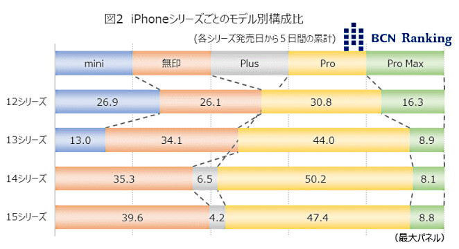 発売から5日間の合計販売台数で、直近4シリーズのモデル別構成比を算出した。4シリーズで共通しているのは、無印・Pro・Pro Max。そこに、12・13シリーズはmini、14・15シリーズではPlusが加わる。4シリーズともProの比率が最も高く3-5割を占める。意外にも構成比が高かったのは、12mini。12無印の比率よりも高かったことが明らかで、13miniも13.0%と健闘している。一方、14・15シリーズにおけるPlusの構成比は5%前後にとどまる。こうしてみると日本ではPlusよりもminiのほうが売れたことは明らかだ。しかし、世界規模で捉えると日本市場は小さいため、アップルは大画面のPlusをラインアップに加えていると言える。