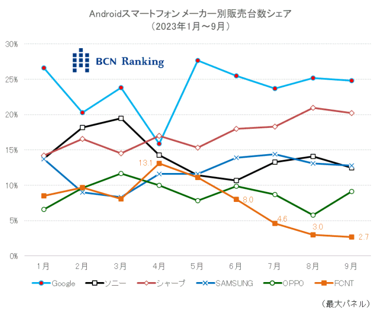 2023年1月から3月、Androidスマホ市場での旧FCNTのシェアは10%前後。SAMSUNGやOPPOと4位、5位を争っていた。4月には新生活需要を取り込み、13.1%のシェアを獲得。一定の存在感を示していた。しかし、経営破綻で状況が一変。3大キャリアは同社端末の取り扱いを継続したものの、シェアは急減。9月には2.7%まで落ち込んだ。