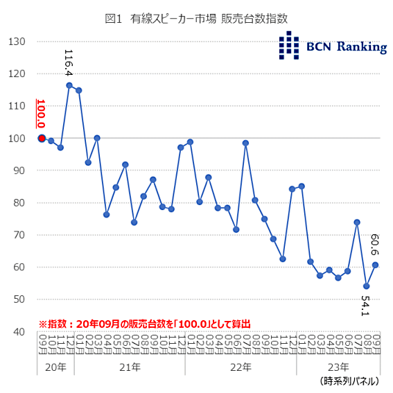 20年9月の有線スピーカーの販売台数を「100.0」として、指数を算出したところ、右肩下がりで推移。23年8月には54.1とほぼ半減していることが分かった。翌9月は60.6まで若干戻したものの、依然として厳しい状況であることには変わりない。また、Bluetoothなどで接続できるワイヤレススピーカー市場も縮小傾向ではあるが、有線スピーカーほどの落ち込みをみせていない。