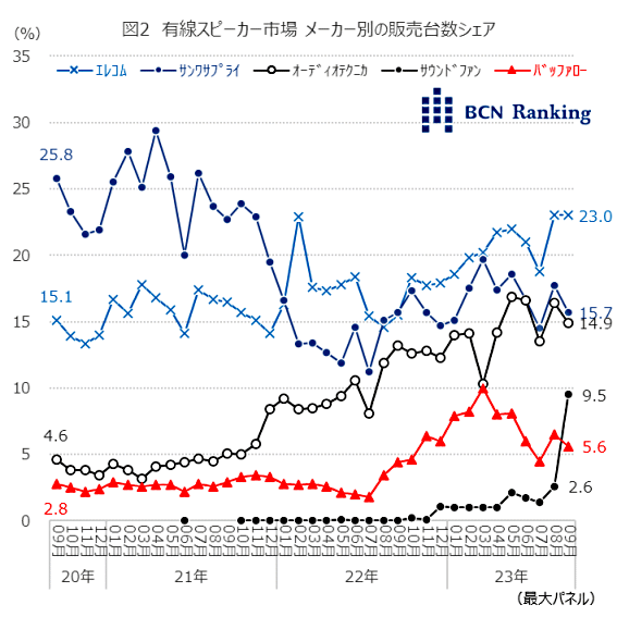 ここ3年における有線スピーカー市場規模は、ほぼ半減という厳しい状況だ。しかし、そのような中でも、サウンドファンのメーカーシェアは、2023年8月から9月にかけて7ポイント近く急増していることが家電量販店・ネットショップの実売データを集計する「BCNランキング」で明らかになった。