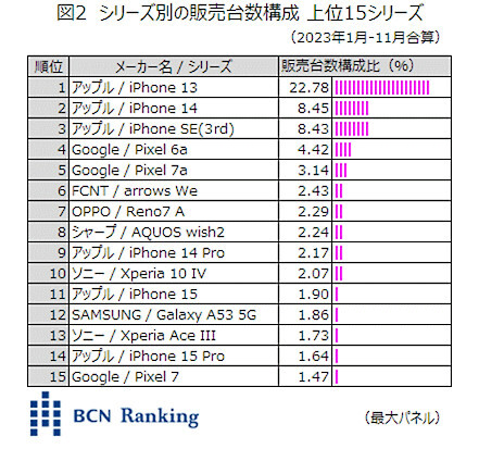 次にシリーズ別をみると、アップルが1位から3位まで占めた。1位から順に「iPhone 13」(24.98%)、「iPhone 14」(9.27%)、「iPhone SE(3rd)」(9.25%)だった。4位と5位はGoogleの「Pixel 6a」(4.85%)、「Pixel 7a」(3.44%)。シリーズ別でもメーカーシェア同様、アップルとGoogleが上位を占めている。