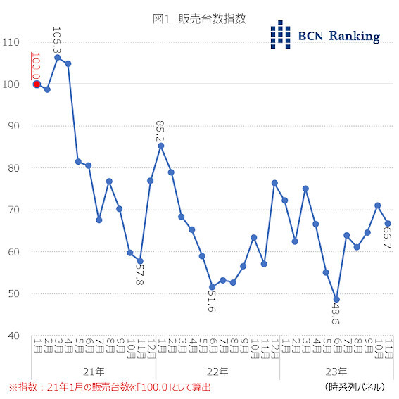 21年1月のスキャナの販売台数を「100.0」として指数を算出した。3月に106.3を記録したもののその後指数は急落、11月には57.8まで市場規模は縮小した。22年1月には85.2まで盛り返すも、半年で51.6まで落ち込むなど変動が激しい。23年6月には48.6と直近3年で最も低い値を記録したが、その後若干持ち直し、11月は66.7まで戻している。