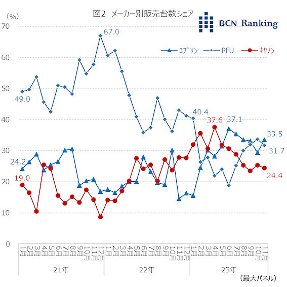 一方、メーカー別の販売台数シェアにおいて21年から22年の間、エプソンとキヤノンに大差をつけ、PFUは首位を維持していた。しかし、22年4月に富士通がリコーに売却を検討していることが報じられ、9月にはリコーの完全子会社となったことも影響したのか、PFUのシェアは4割を下回る月が常態化していった。その隙を突くようにキヤノンが首位となった。その後もじわじわとシェアを上げていたキヤノンだが、23年4月の37.6%をピークにシェアは右肩下がりとなり、6月にはエプソンに抜かれた。PFUも徐々にシェアを回復し、23年10月に9か月ぶりに首位となった。11月は再びエプソンに抜かれたが、そのシェア差は2ポイント弱と僅差だ。