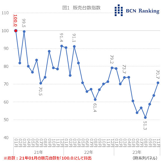 2021年1月のLEDスタンドライトの販売台数を「100.0」として指数を算出した。同市場では3月と12月に指数が跳ね上がる一方、7月や8月に年間での指数が最低を記録するということも分かった。こうした動きを繰り返しながらも、市場における需要は減少している。ただし、23年11月は70.7まで盛り返しており、12月には前年を上回る水準に達する可能性も出てきている。