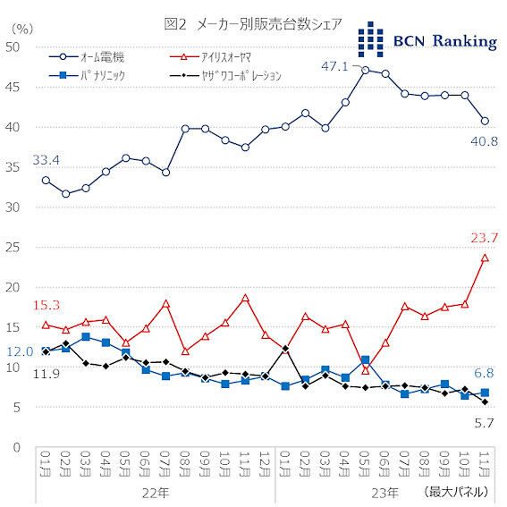 メーカー別の販売台数シェアでは、オーム電機が首位を独走している状態だ。同社のシェアは22年1月に33.4%で、その後じりじりと右肩上がりに推移、23年5月には47.1%と5割目前に迫った。しかし、翌月以降若干シェアを落とし11月は40.8%だった。アイリスオーヤマとパナソニック、ヤザワコーポレーションの3社は2位争いを展開。アイリスオーヤマは23年5月以降シェアを伸ばし、11月にはパナソニックとヤザワコーポレーションを引き離している。この動きの裏には平均単価の差が影響していると言えそうだ。ヤザワコーポレーションは22年1月以降平均単価は上昇しているが、アイリスオーヤマはシェアを伸ばし始めた23年5月以降、平均単価が下落し続け、23年11月は最も安値となっている。