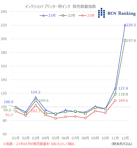 2021年1月のインクジェットプリンター用インクの販売数量を「100.0」として指数を算出した。インクの最需要期は12月であるのは、年賀状作成に関連していることは周知の通りだ。また、年度末の引っ越しや移動などに伴い、3月にもインクの需要は若干増加する。では、数量指数の推移を比較してみる。まず年度末の3月では、21年は114.2であったのに対し、22年は109.6、23年は102.3と需要の減少は明白だ。最需要期の12月は21年が220.5、22年は197.5とこちらも指数は下がっている。11月の時点でも23年は21年、22年を下回っており、12月も22年を下回る水準に着地するということは想像に難くない。