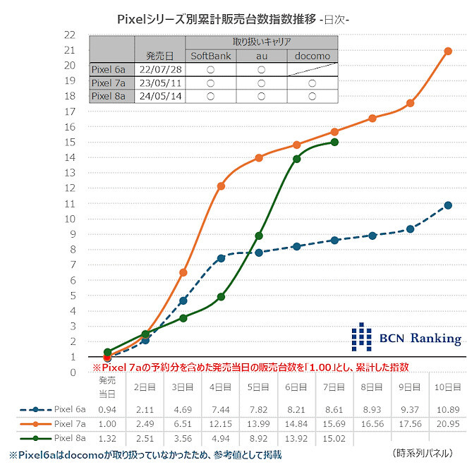 ※グラフには22年7月28日発売のPixel 6aも含めているが、docomoが取り扱っていなかったため、参考値となる。
