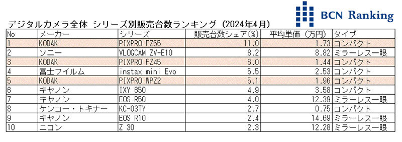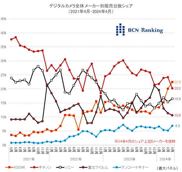 2024年4月、コンパクトデジカメ(コンデジ)、ミラーレス一眼、一眼レフを合算したデジカメ全体の市場で、KODAKが22.5%の販売台数シェアを獲得。BCNがデジカメのデータ集計を始めてから、初のメーカー別シェア月間1位となったことが、家電量販店・ネットショップの実売データを集計する「BCNランキング」から明らかとなった。