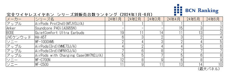 2024年6月の完全ワイヤレスイヤホン(TWS)のシリーズ別販売台数ランキングは、アップル「AirPods Pro(2nd)(MTJV3J/A)」が首位を獲得。23年9月の発売から高い人気を維持している。家電量販店・ネットショップの実売データを集計する「BCNランキング」から24年6月のTWS市場を振り返る。