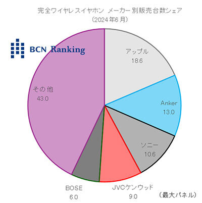 メーカーシェアはアップルが18.6%で首位を維持した。前月初めてソニーを逆転して2位に浮上したAnkerは、13.0%のシェアで2か月連続の2位となった。