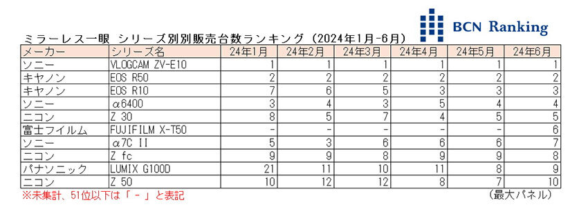 2024年6月のミラーレス一眼のシリーズ別販売台数ランキングは、ソニー「VLOGCAM ZV-E10」が首位を獲得した。家電量販店・ネットショップの実売データを集計する「BCNランキング」から24年6月のミラーレス一眼市場を振り返る。