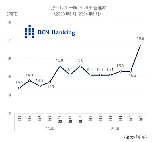 ミラーレス一眼市場の平均単価は23年6月から9月までは14万円台で推移したが、10月以降は15万円台と緩やかに上昇。24年6月には24年で最高の16.8万円に達した。高価格帯の新製品が発売されたことに加え、原材料費、物流コストなどの高騰による既存製品の値上げが影響している。