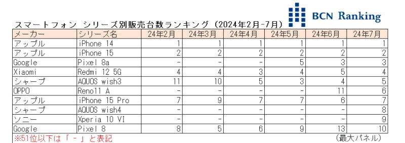 2024年7月のスマートフォンのシリーズ別販売台数ランキングは、アップルの「iPhone 14」が首位を獲得。23年10月から10か月連続の1位となった。家電量販店・ネットショップの実売データを集計する「BCNランキング」から24年7月のスマートフォン市場を振り返る。