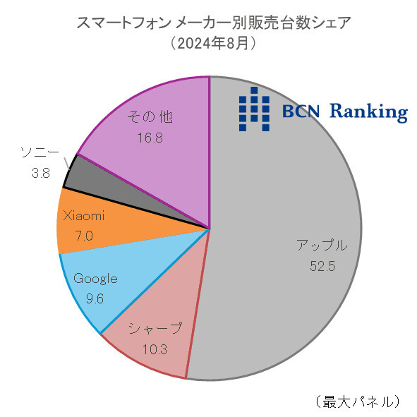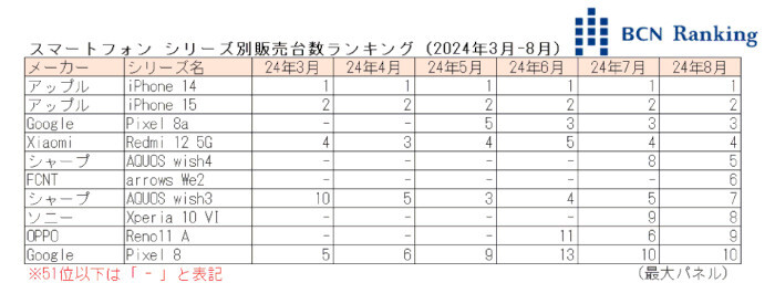 2024年8月のスマートフォンのシリーズ別販売台数ランキングは、アップルの「iPhone 14」が首位を獲得。23年10月から11か月連続の1位となった。家電量販店・ネットショップの実売データを集計する「BCNランキング」から24年8月のスマートフォン市場を振り返る。