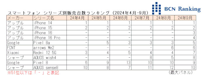2024年9月のスマートフォンのシリーズ別販売台数ランキングは、アップルの「iPhone 14」が首位を獲得。23年10月から12か月連続の1位となった。家電量販店・ネットショップの実売データを集計する「BCNランキング」から24年9月のスマートフォン市場を振り返る。