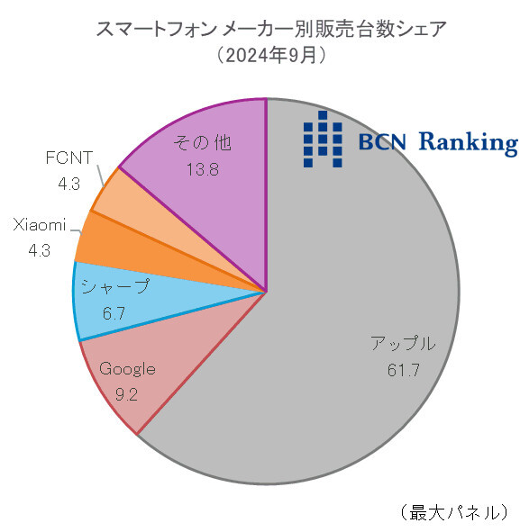 メーカー別の販売台数シェアでは、アップルが61.7%を占めて首位を維持。同社のシェアが6割を超えるのは24年3月以来6か月ぶりだ。新シリーズ発売や、それに伴う旧シリーズの値下げなどがシェアを押し上げた。