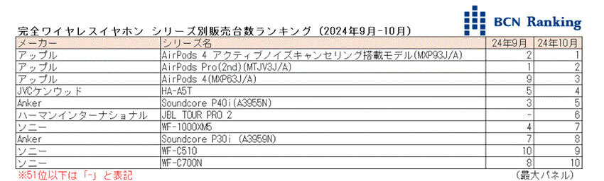 2024年10月の完全ワイヤレスイヤホンのシリーズ別販売台数ランキングは、アップルから24年9月発売になった新製品「AirPods 4 アクティブノイズキャンセリング搭載モデル(MXP93J/A)」が初めて首位を獲得した。前月1位だった同社の「AirPods Pro(2nd)(MTJV3J/A)」は2位に後退。連続首位記録は12か月でストップした。家電量販店・ネットショップの実売データを集計する「BCNランキング」から24年10月の完全ワイヤレスイヤホン市場を振り返る。