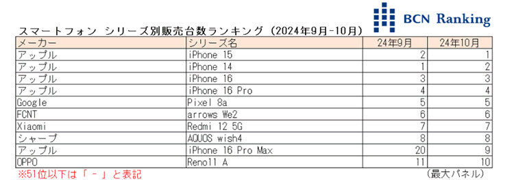 2024年10月のスマートフォンのシリーズ別販売台数ランキングは、アップルの「iPhone 15」が首位を獲得。23年9月に発売されてから、初めて月間1位となった。家電量販店・ネットショップの実売データを集計する「BCNランキング」から24年10月のスマートフォン市場を振り返る。