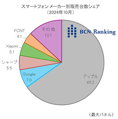 メーカー別の販売台数シェアでは、アップルが65.2%を獲得。2か月連続で6割を超えた。TOP5に変動はなく、依然としてアップル一強状態が続いている。