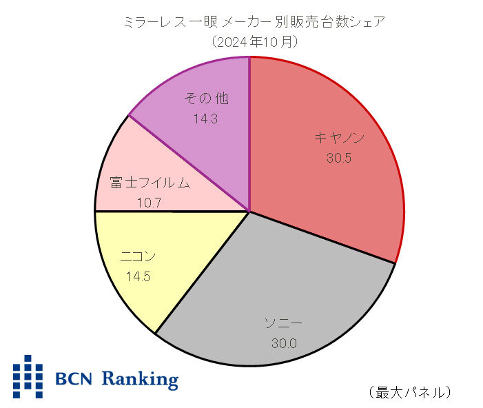 2024年10月のミラーレス一眼のメーカー別販売台数シェアは、キヤノンが30.5%で1位を獲得した。同社の首位は24年5月以来、5か月ぶり。家電量販店・ネットショップの実売データを集計する「BCNランキング」から24年10月のミラーレス一眼市場を振り返る。