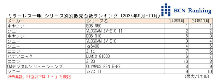 ソニーは8月発売の新製品「VLOGCAM ZV-E10 II」を筆頭に、4製品がTOP10内にランクイン。10位の「α7C II」はフルサイズ機としては唯一のTOP10入りだ。