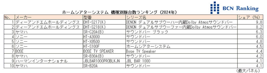 2024年のホームシアターシステム機種別販売台数ランキングで、ディーアンドエムホールディングスが展開するDENONブランドのサウンドバーが1位、2位を獲得した。同社はメーカー別の販売台数シェアでも年間首位となっている。家電量販店・ネットショップの実売データを集計する「BCNランキング」から24年のホームシアターシステム市場を振り返る。