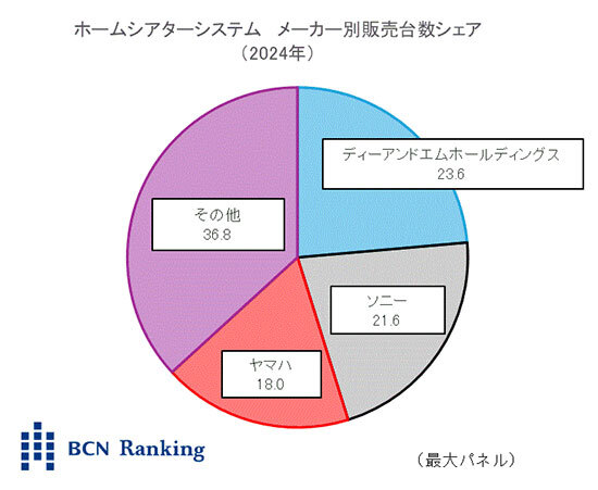 24年のホームシアターシステム市場は、販売台数前年比が77.2%と2割以上縮小した。上位メーカーであるソニーは前年比62.4%、ヤマハは82.8%とそれぞれ前年を大きく下回ったが、ディーアンドエムホールディングスは前年比104.5%と前年比プラスを維持。ソニーとヤマハを抜き、年間首位に躍り出る形となった。(BCN総研・筧采斗)