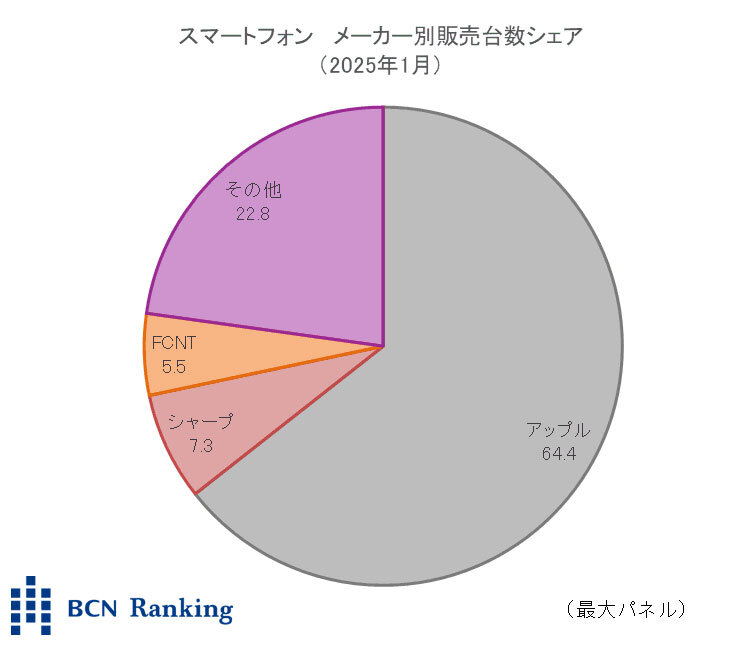 25年1月のスマートフォン市場は、アップルが64.4%で首位を獲得した。24年9月以降、5か月連続で6割台を維持している。