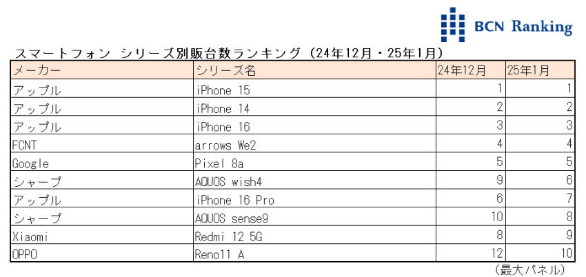 25年1月のシリーズ別販売台数ランキングは、アップルの「iPhone 15」が1位を獲得。「iPhone 14」が2位、「iPhone 16」が3位で、24年12月に続き、アップルがTOP3を独占した。