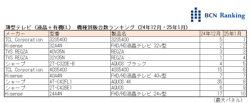 25年1月の機種別販売台数ランキングは、TCL Corporationの32型液晶テレビ「32S5400」が首位を獲得した。同製品の1位は24年4月以来、9か月ぶりとなる。