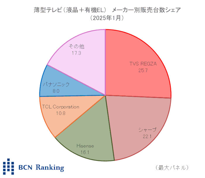 25年1月のメーカー別販売台数シェアはTVS REGZAが1位を獲得。シェアは25.7%と全体の4割以上占めた。同社の首位は23年10月から16か月連続で、独走態勢が続いている。