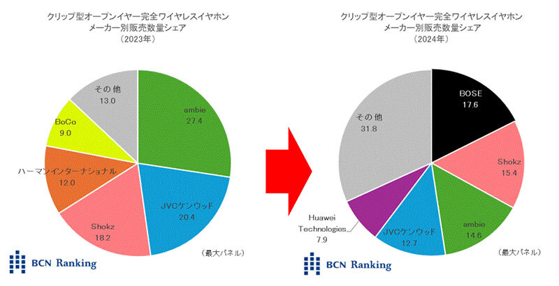クリップ型オープンイヤーTWS市場は立ち上がって間もないため、メーカー間のシェア争いは激しい。23年は、イヤーカフのように耳に装着する製品で話題となったambieを筆頭に、上位5社で9割近いシェアを占めていた。しかし、24年になるとTOP5の顔触れは変わり、シェアも大きく変動している。上位メーカーによる占有率は下がり、多数のメーカーによるシェア争いが起きたことが分かる。
