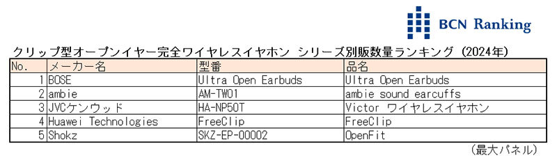 市場の先駆け的存在でもあるambieの「ambie sound earcuffs(AM-TW01)」はロングヒットとなっている。21年12月発売にも関わらず、24年のシリーズ別ランキングで年間2位を獲得した。24年10月には後継機「AM-TW02」が登場。すでに月間ランキングでは上位入りしている。ambieは23年のメーカーシェアが1位、24年が3位とTOP3を維持。25年も上位争いに加わる可能性が高いだろう。
