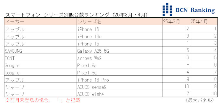 前月1位だった「iPhone 15」が3月の新生活商戦を経て販売台数を大きく減らしており、代わって「iPhone 16」が首位に繰り上がる形となった。また、廉価モデルの「iPhone 16e」も同様に1ランクアップで2位に浮上した。