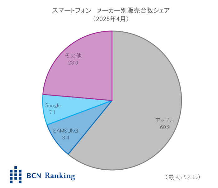 「Pixel 9a」発売で、Googleのメーカー別販売台数シェアは前月から2.1ポイント増加。4月のシェアは7.1%で、シャープを逆転して4か月ぶりにTOP3へと返り咲いた。