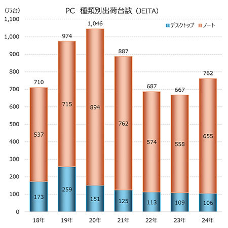 電子情報技術産業協会(JEITA)によると、24年のPC出荷台数は762万台に達した。前年から100万台近く積み上げており、その主な要因は、法人市場において、Win10 EOSに備えたリプレース需要が発生したためだ。