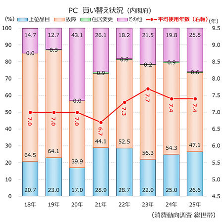 18~25年にかけて「故障」が4~6割と高い比率を占めている。しかし、20年は「その他」が43.1%に達した。これはWin7 EOSにより買い替え需要が発生したためだ。