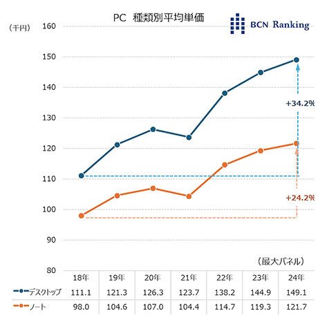 まず、デスクトップの平均単価は、18年に11万1100円。年々上昇し、24年には14万9100円に達した。6年で実に34.2%も上昇した計算だ。また、ノートも同様に上昇しており、18年の9万8000円から24年には12万1700円。こちらも6年で24.2%上昇した。