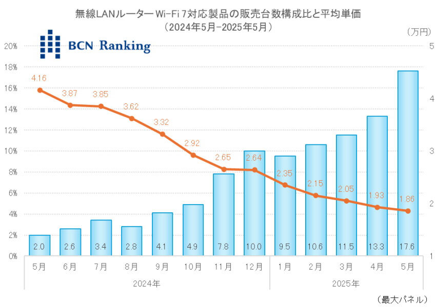 無線LANルーター市場ではWi-Fiの最新規格であるWi-Fi 7に対応する製品の販売台数構成比が増加している。家電量販店・ネットショップの実売データを集計する「BCNランキング」では、2025年5月のWi-Fi 7対応製品の構成比は過去最高の17.6%だった。製品ラインアップの拡充や平均単価の下落、Wi-Fi 7対応デバイスが増加したことによる需要の増加が要因と考えられる。