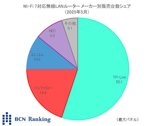 Wi-Fi 7対応無線LANルーターに絞った市場での、25年5月のメーカー別販売台数シェアは、TP-LINKが55.1%と過半数を占めた。売れ筋製品は「Archer BE7200」や「Archer BE3600」。それぞれ平均単価は約1万円のエントリーモデルで、市場全体の平均単価を8000円程度下回っている。