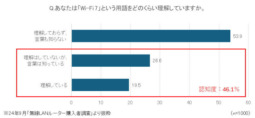 BCNが24年9月に実施した「無線LANルーター購入者調査」にて、「Wi-Fi 7」という用語の認知度を訊いたところ、認知度(「理解している」19.5%、「理解していないが、言葉は知っている」26.6%の合計)は46.1%と、半数を下回った。現状、認知度はより高まっている可能性もあるが、Wi-Fi 7を知らないユーザーも一定数存在しているとみられる。