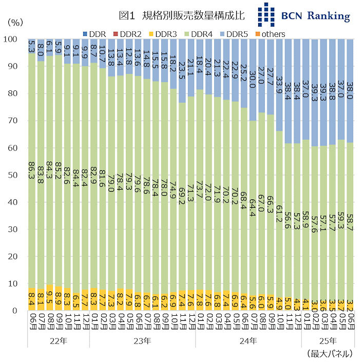 現在、メモリの最新規格は「DDR5」となる。しかし、一世代前の「DDR4」が販売のボリュームゾーンだ。DDR4の構成比は、2022年6月時点で86.3%を占めていたが、月を追うごとに構成比は減少。24年11月に56.6%と6割を下回り、25年6月は58.7%と若干持ち直したものの5割台で推移している。代わりに構成比を伸ばしているのが、最新規格のDDR5だ。23年2月に10.7%と初めて2ケタになり、24年10月に33.9%に達した後、25年6月まで4割を少し下回る水準を維持している。