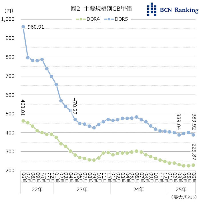 まず、DDR4が300円を下回ったのは23年5月で、その後25年2月ごろまで250-300円で推移。再び下落に転じ、25年6月は229.87円。一方、DDR5のGB単価の変動はDDR4よりも激しく、22年6月から急落している。23年5月に初めて500円を下回った後、GB単価の下落は緩やかになり、25年2月まで400-500円の間で遷移する。翌3月に400円を下回ったが、その後も400円前後で推移している。