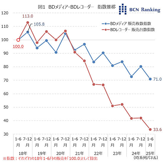 18年1-6月のBDメディアの販売枚数を「100.0」として指数化したところ、22年から下落に転じていることが明らかとなった。上下動を繰り返しながらも、指数は減少し続け、25年1-6月は71.0と約3割減の規模まで縮小。そこでBDメディアと関連が深い、BDレコーダー市場の販売台数指数も算出してみた。BDメディア市場よりも早く、21年から指数が減少し始め、7年半で3分の1まで縮小した。この2つの指数は差が開きつつある。