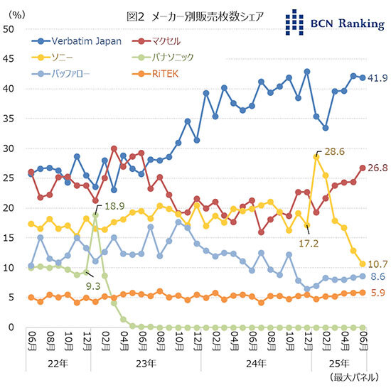 首位争いをしていたVerbatim Japanとマクセルだったが、23年7月からVerbatim Japanのシェアは右肩上がりに推移、独走体制に入っていく。一方、マクセルはソニーと2位争いを展開。パナソニックの生産終了の発表からちょうど2年後の25年1月23日、今度はソニーが、同年2月にBlu-rayメディアの生産終了を発表。ソニーのシェアは10ポイント超跳ね上がり、25年1月は28.6%まで達した。その後、ソニーと2位争いを展開していたマクセルのシェアが復調。25年6月に26.8%まで戻している。