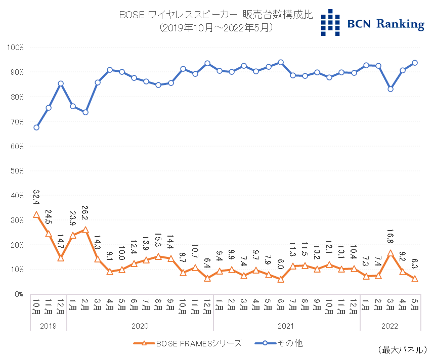 BOSEが販売するワイヤレススピーカーの中で、「BOSE FRAMES」シリーズが占める販売台数構成比を見ると、特に初動では大きな反響があった。それまでなかった斬新なデバイスということもあって、シリーズ第1弾の「BOSE FRAMES ALTO」を発売した19年10月には32.4%と大きな構成比を占めた。ガジェット好きで新しい商品に敏感な層の反応が良かったことが伺える。シリーズ第2弾の「BOSE FRAMES RONDO」を発売した20年1月、続く2月も25%前後を記録。その後は、22年3月にセール価格で販売した影響で一時的に16.8%に構成比が上昇するも、基本的には10%前後で推移している。