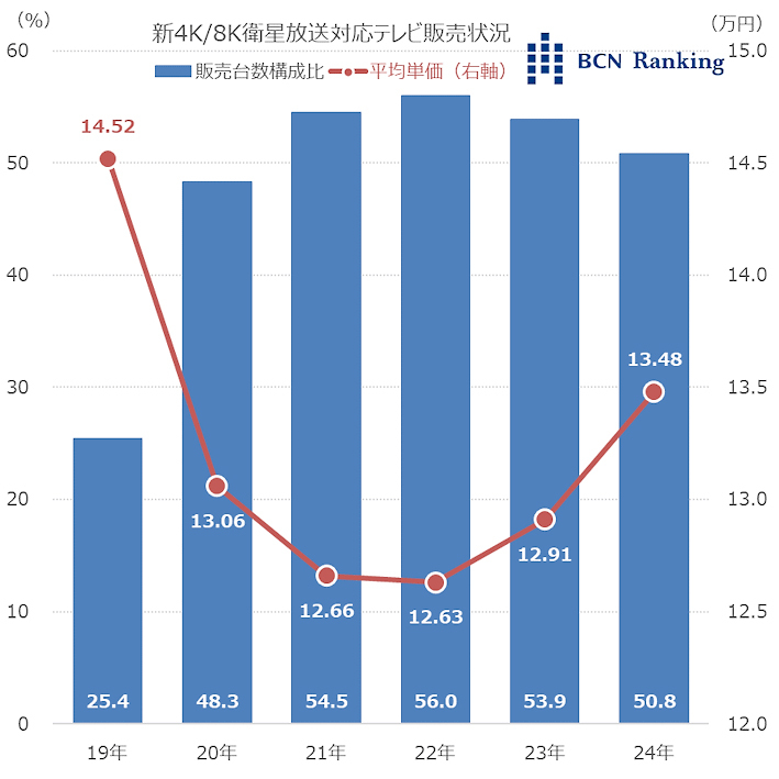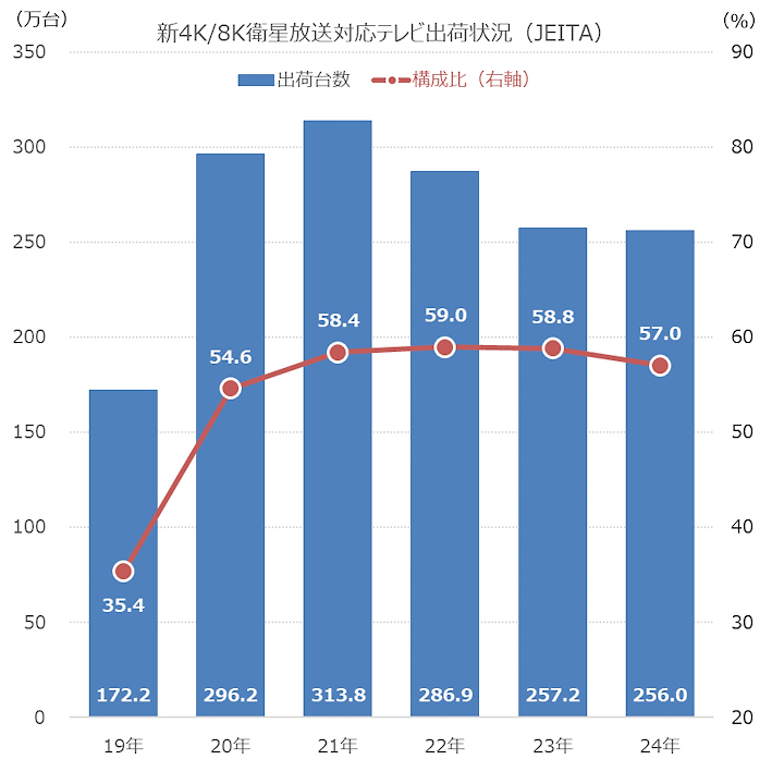 「新4K/8K衛星放送」対応テレビが出荷・販売台数で半数超え! 2025/06/29 18:00 Tweet 1/2 新4K/8K衛星放送対応テレビ出荷状況 記事詳細ページ データサービス・リサーチについて お問い合わせはこちら 注目の記事 負の連鎖に陥るレコーダー市場、出荷と普及率、発売機種数のすべてで減少 無線LANルーター市場でWi-Fi 7対応比率が過去最高、2割に迫る スマホは頭打ち!?「普及率」が初の前年割れ、しかし販売は過去最高 5カ月を切った!Windows 10サポート終了への道程、PC市場の現状を調べた 【実売データでわかる売れ筋ランキング(1位~20位)】(毎週木曜日更新) 外部リンク 電子情報技術産業協会=https://www.jeita.or.jp/japanese/ 「BCN総研」=https://www.bcnsoken.com/