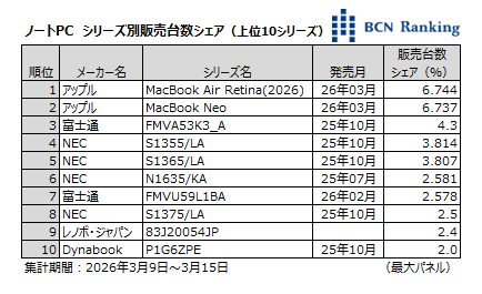 MacBook Neoが発売初週2位、新ラインアップ好発進 2026/03/16 18:00 Tweet 1/1 シリーズ別販売台数シェア(上位10シリーズ) 記事詳細ページ データサービス・リサーチについて お問い合わせはこちら 注目の記事 iPhone 17シリーズの初速、12シリーズ以後最低 SAMSUNGが内蔵SSD市場で首位、安さよりも大容量を優先か? Ankerがアップルを逆転、完全ワイヤレスイヤホン市場で首位 パナソニック・ソニー撤退後のBDメディア市場 【実売データでわかる売れ筋ランキング(1位~20位)】(毎週木曜日更新)