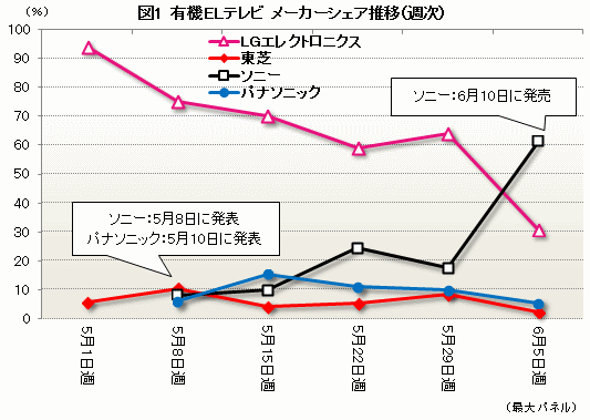 ソニーとパナソニックが有機ELテレビを発表する前週(5月1日週)から、ソニーの発売日が含まれる6月5日週までのメーカーシェアの推移(図1)をみると、2社が発表する以前はLGエレクトロニクスが9割以上を占めていたが、2社が発表してからは、予約数だけでソニーとパナソニックが1~2割のシェアを確保した。そして、6月5日週にはソニーが6割超にシェアを拡大し、発売の初週でトップシェアを獲得した。このことから、ソニーが発売したことの影響度は高いことが伺え、パナソニックが発売日を迎える時点では、市場がより活況を呈していくことになりそうだ。